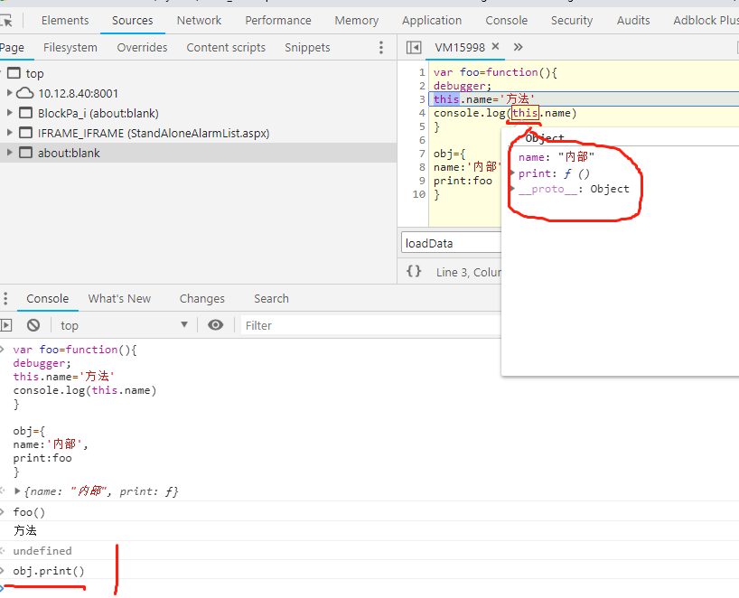 obj.print() 打印 ‘方法’;如下图,因为obj.print();调用时foo函数内的this指向确实是obj对象,