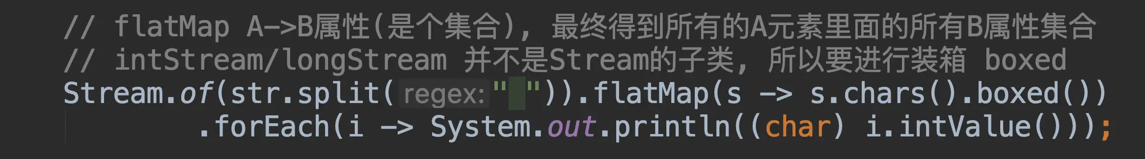 下面这个例子中将一首唐诗生成一个按行分割的流,然后在这个流上调用flatmap得到单词的小写形式的集合,去掉重复的单词然后打印出来