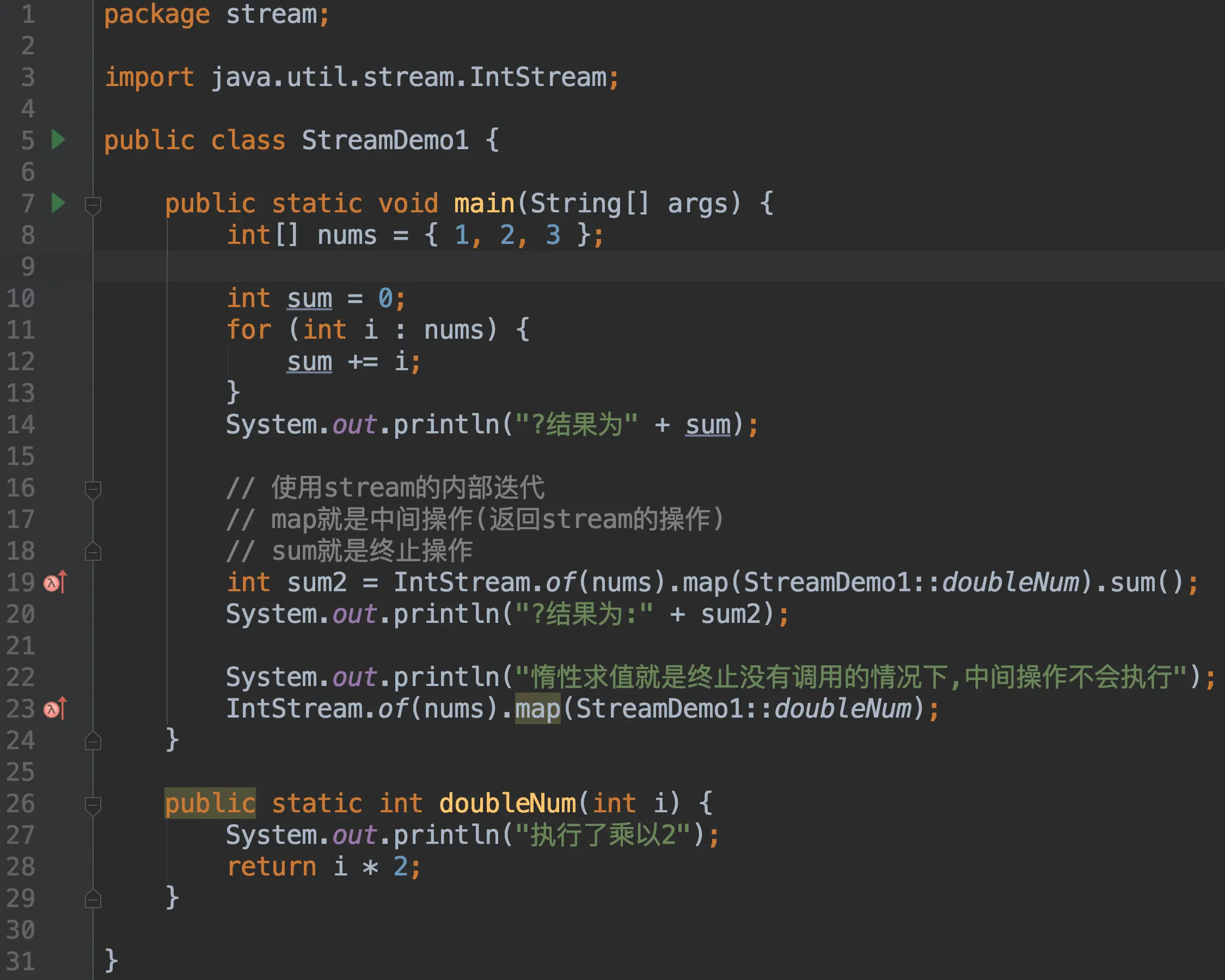 中间操作会返回一个新的流,并且操作是延迟执行的,它不会修改原始数据源,而是由在终点操作开始的时候才真正开始执行