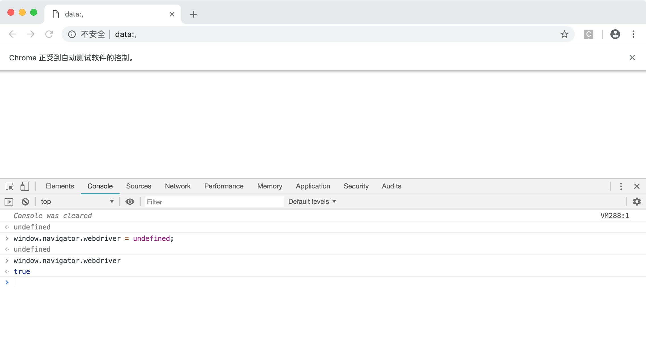 再次在开发者工具的Console选项卡中查询window.navigator.webdriver,可以发现这个值已经自动变成undefined了。并且无论你打开新的网页,开启新的窗口还是点击链接进入其他页面,都不会让它变成true。运行效果如下图所示。