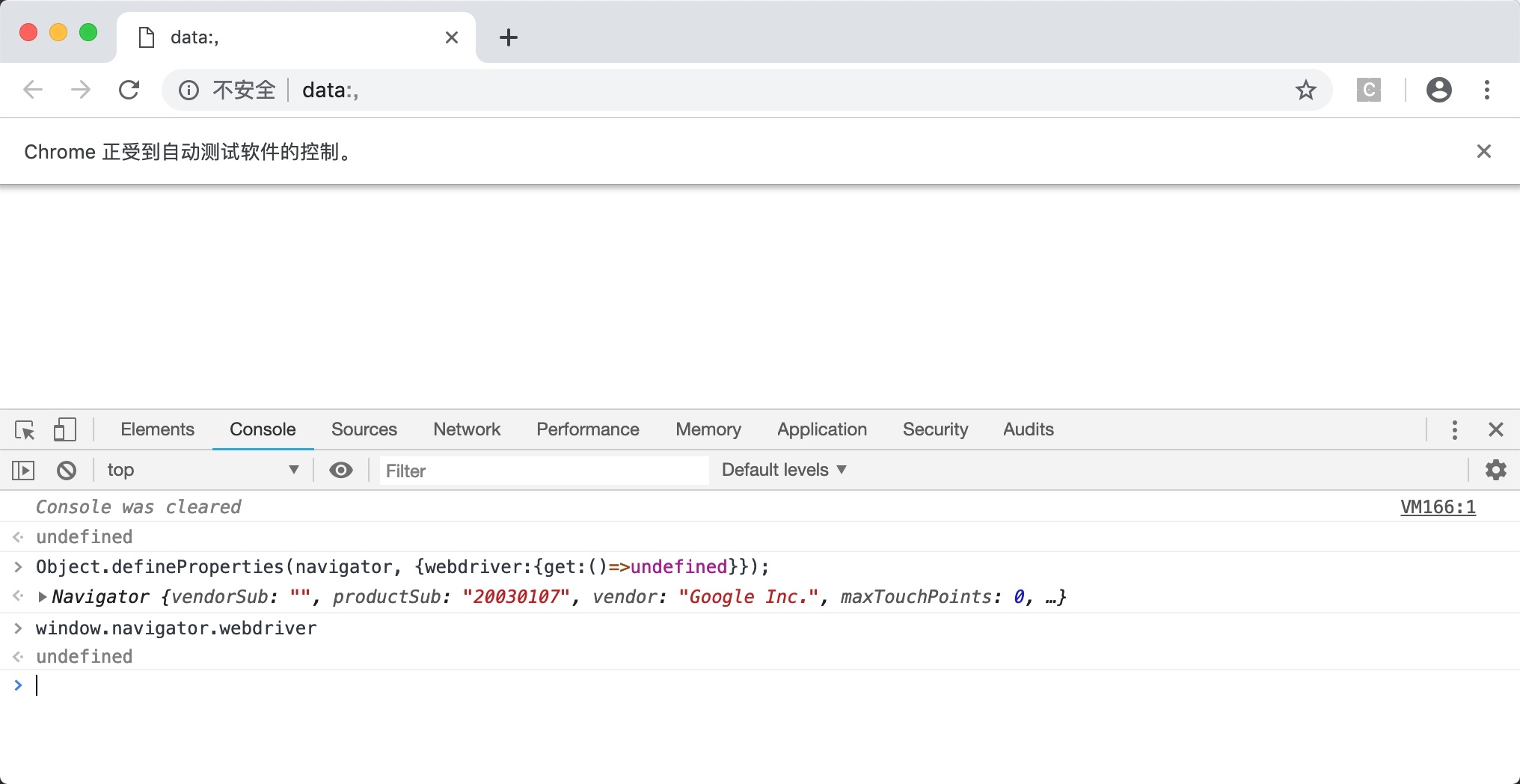 但是,如果你打开一个普通的Chrome窗口,执行相同的命令,可以发现这行代码的返回值为undefined,如下图所示。