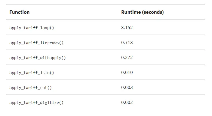 这与我们上面的循环操作相比如何?首先,你可能会注意到不再需要apply_tariff(),因为所有条件逻辑都应用于行的选择。因此,你必须编写的代码行和调用的Python代码会大大减少。