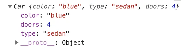 class Car { constructor(color, type, doors) { this.color = color; this.type = type; this.doors = doors }}const myCar = new Car('blue', 'sedan', '4');console.log(myCar);
