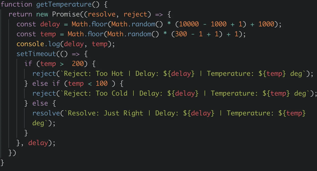 We are going to refactor our getTemperature() function to return a promise. And instead of setting the result, we will reject the promise unless the result is “Just Right,” in which case we will resolve the promise. In either case, we will pass in some values to both resolve and reject.