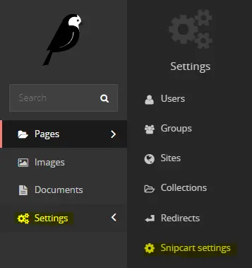 Remember the SnipcartSettings class you created? You'll be able to configure your API key by expanding the Settings menu and going to Snipcart settings.