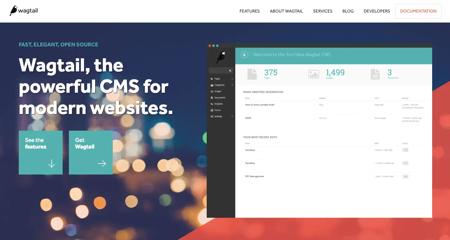Wagtail is a developer-first Django content management system. Free and open source, it was developed by the good-hearted folks at Torchbox. It’s elegant, flexible, and, IMHO, kicks ass.
