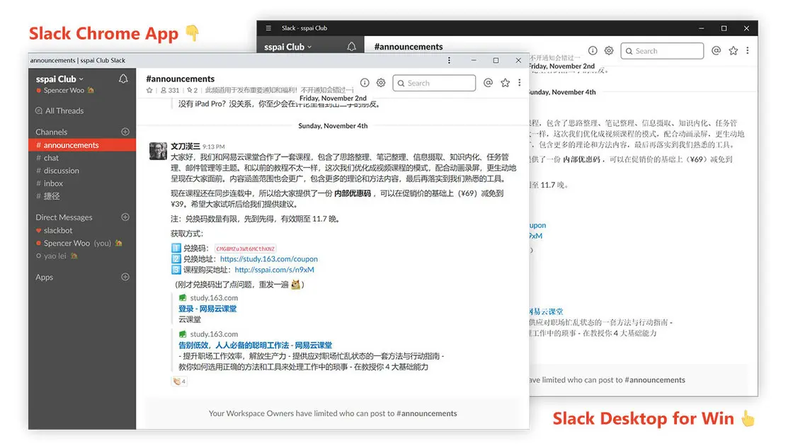 跟来自微软商店的 Slack 版本进行对比:左侧利用 Chrome App 制作的客户端的 UI 不仅是正常的非衬线字体,显示效果也要比右侧的好上不少。令人愉悦!
