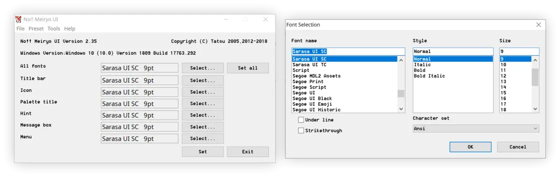 其中我们要运行的就是那个 exe 文件。点击运行程序,然后我们将默认的微软雅黑替换为刚刚安装好的更纱黑体「Sarasa UI SC」:选择「Select...」菜单,在「Font Selection」中选择「Sarasa UI SC」,然后选择「OK」;之后在主页面选择「Set all」,稍等片刻,主页面中全部选项就设置为更纱黑体了,然后我们点击「Set」,这样就完成了我们字体的替换。