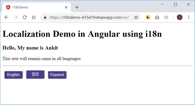 The application, which we built here, is hosted at i18ndemo-415ef.firebaseapp.com/en/. If you open this URL, you will see the output as shown below: