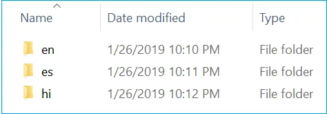 npm run build-localeOn successful execution, it will create a “dist” folder in the application’s root folder. The dist folder has three sub-folders to serve our application in three different languages. Refer to the image shown below: