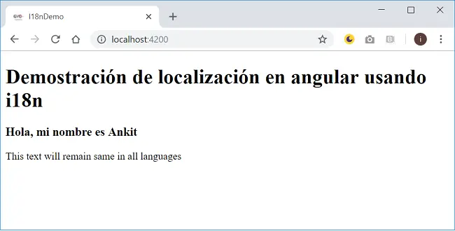 <h1 i18n> Localization Demo in Angular using i18n</h1><h3 i18n="@@myName"> Hello, My name is Ankit</h3><p>This text will remain same in all languages</p><hr />You can observe that we have marked <h1> and <h3> tags with i18n attribute. This is a way to tell the Angular to consider this text as translatable content. We will explore i18n attribute in detail in the next section.