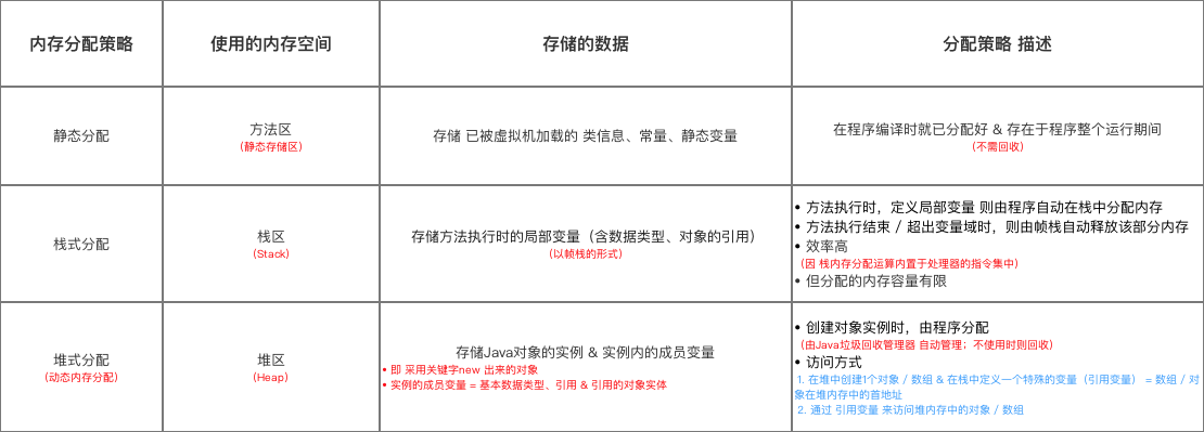 共有3种:静态分配、栈式分配、 & 堆式分配,分别面向静态变量、局部变量 & 对象实例