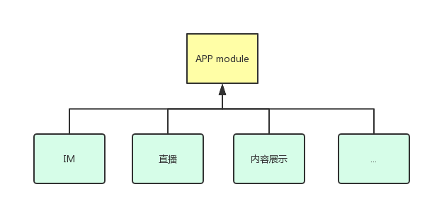 当然,作为一位合格的App架构师,遇到再难的问题也会迎难而上。于是便开始对APP整体项目结构进行分析,制定解耦方案。通常情况下,解耦的最佳思路就是根据业务边界对代码结构进行划分。比如说某APP里面包含了IM、直播、内容展示等等业务场景,于是从架构的角度来说,整个APP的架构应该是如下图所示: