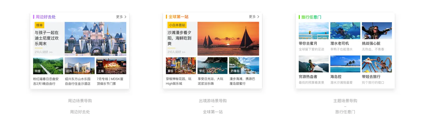 后来我们新起了场景化项目,有个业务小组产出了全球第一站、周边好去处这两个出境、周边的导购场景。