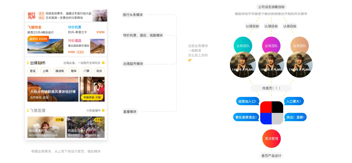旧版飞猪的框架依然是围绕业务架构建立的。而在这次改版中,我们希望基于每一个普通旅行者的视角,来建立新的首页框架。