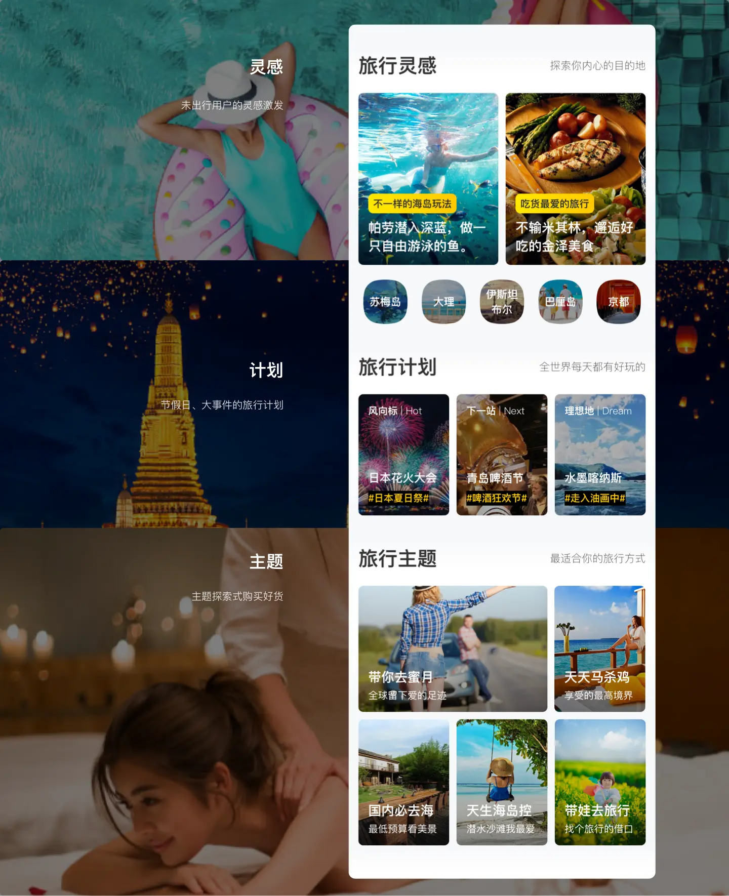 在2018,我们初步将主题组织成了灵感、计划、商品三个维度,希望能在玩什么、什么时间去、买什么等旅行决策上,对用户由内而外地产生帮助。