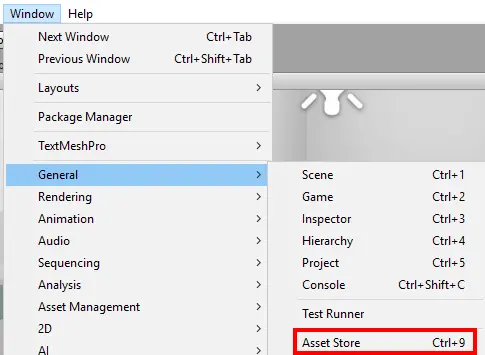 在顶部栏中选择Window> General> Asset Store打开Asset Store:
