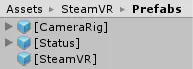 打开SteamVR文件夹,查看里面的文件夹。 您将从Prefabs文件夹中将一些必要的VR GameObjects添加到场景中。