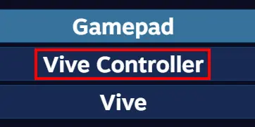 首先,如果您连接了游戏手柄或其他兼容硬件,则需要先切换到Vive Controller绑定。 例如,单击Gamepad,然后选择Vive Controller切换到控制器设置。