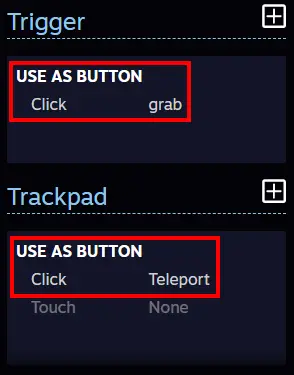 现在对Trigger和Trackpad执行相同的操作:为每个触发器创建一个新的Button输入,将Trigger的Click事件链接到Trackport并将Trackpad的Click事件链接到Teleport。 完成后一定要保存这些。