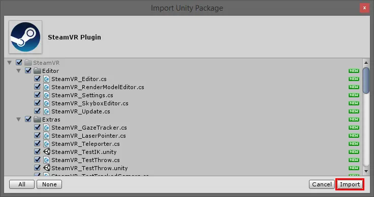 当您打开一个新项目并导入SteamVR时,您会看到很多条目。 由于入门项目已经过很好的优化,因此这里唯一的建议是禁用解析对话框。
