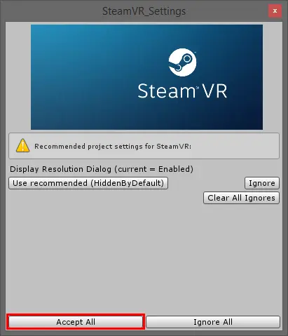 单击Accept All以执行所有建议的更改。 关闭Asset Store并切换回Scene视图。 您现在将在Project窗口中有一个名为SteamVR的新文件夹: