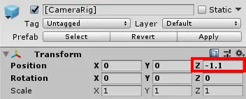 [CameraRig]更有趣,因为它控制着Vive的headset和控制器。 选择[CameraRig]并在Inspector中将其Position设置为(X:0,Y:0,Z:-1.1),以便在桌子后面滑动整个装备。