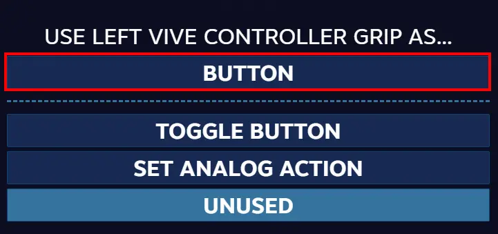现在,通过单击其名称旁边的大加号按钮并在弹出的窗口中选择BUTTON,为Grip定义一个新的Button绑定。