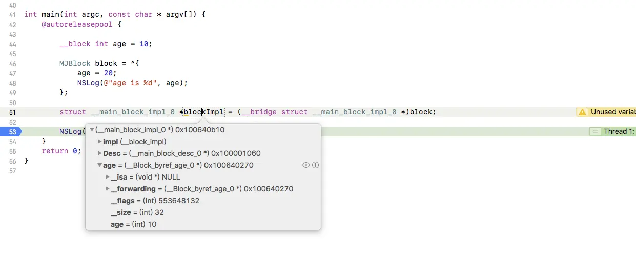 int age = __cself->age; // 将block当初捕获的变量,赋值给执行函数