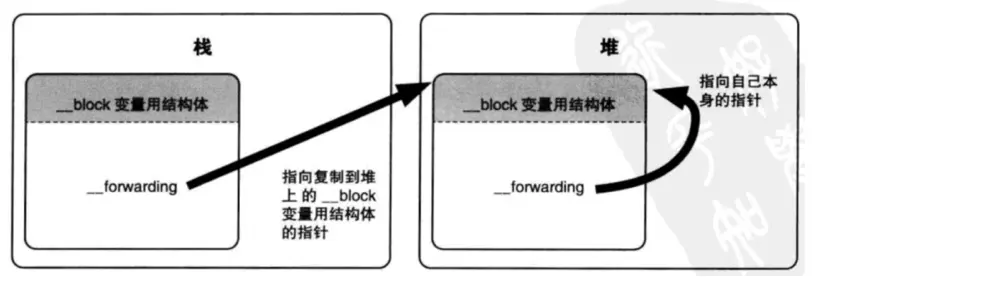 __block包装对象在堆中也会被复制一份。而二者的__forwarding指针都指向堆中的__block包装对象。