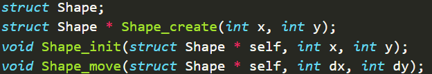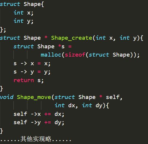 这里定义了一个叫做Shape的结构体,外界只能通过相关的函数来对这个Shape进行操作,例如创建(Shape_create), 移动(Shape_move), 还有获取位置(Shape_getX)等,不能直接访问Shape的内部数据结构。
