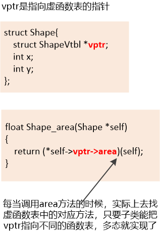 现在C有点明白了, 无论是Rectangle对象,还是Square对象,在调用Shape_area方法的时候, 都需要通过vptr这个指针找到虚函数表中的area方法,对于Rectangle,找到的是Rectangel_area方法,对于Square,找到的是Square_area方法。