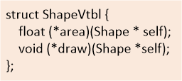 “这个结构体包含了两个函数指针,一个用来计算图形的面积,另外一个把这个图形画出来。我们把这个结构体叫做虚函数表。”