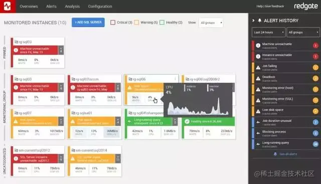 这个工具的界面十分易用,可以帮你快速、轻松地查找问题。可以在主屏幕上查看数据库实例、等待时间、查询建议、CPU(带有警告和关键警告)、内存、磁盘和会话等信息。