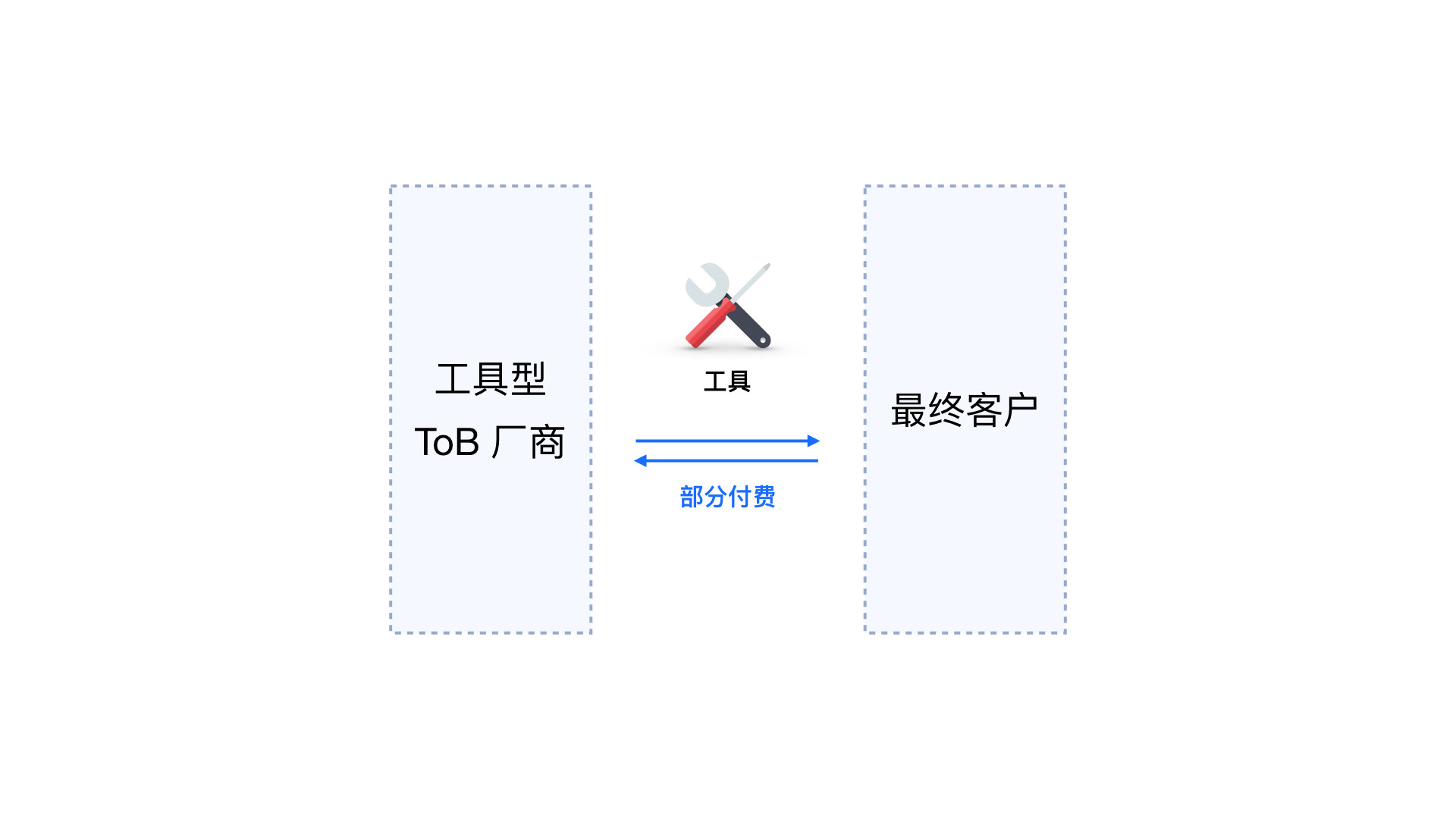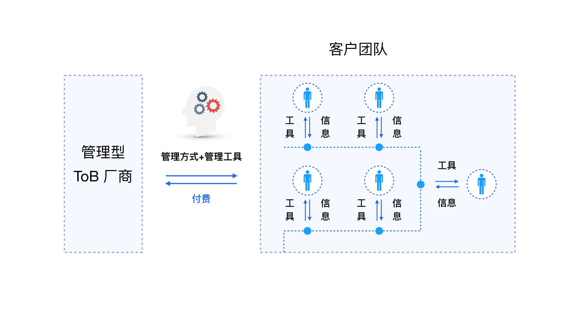 - 从工具型 To B 转型成管理型 To B,从一开始就提供 SaaS 服务,依靠单点突破,再延长产品线提供整套能力,这个方式的痛苦在于你最终的目标用户在现阶段并不会采购你的产品(需要流水线+螺丝刀的公司不会先买一把螺丝刀用着),你目前服务的客户的需求可能并不能帮助你做出更适合最终用户的产品。