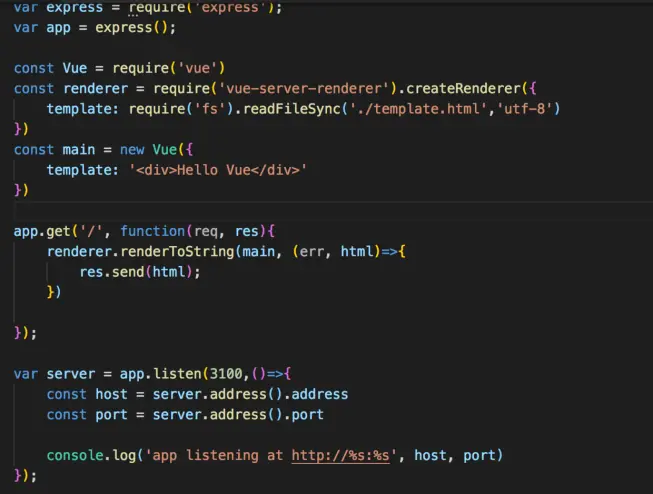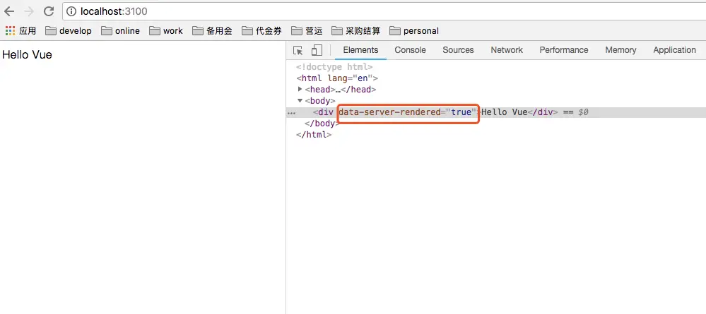 浏览器打开http://localhost:3100/,会看到data-server-rendered = “true”,表示是服务端渲染