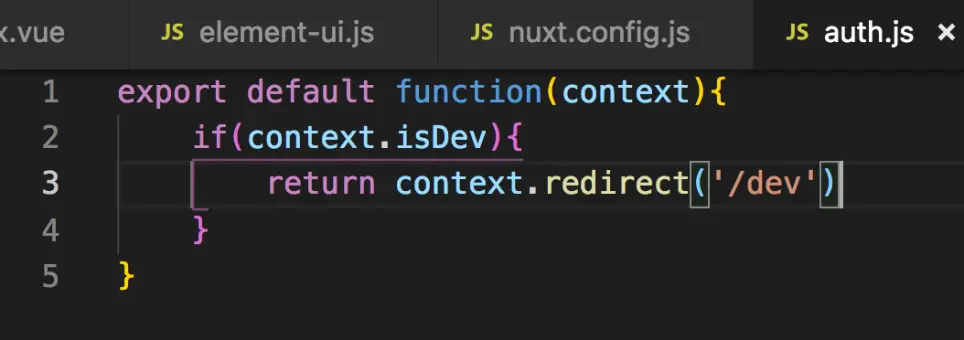 中间件(middleware)是允许你定义一个自定义函数(提供了一个context参数,可以获取sever端和client端各种信息)运行在一个页面或布局之前。比如我们在渲染页面之前判断权限的拦截,或者根据用户权限跳转到相应的路由等。 就本地开发环境时跳转到指定路由为例,可这么配置: