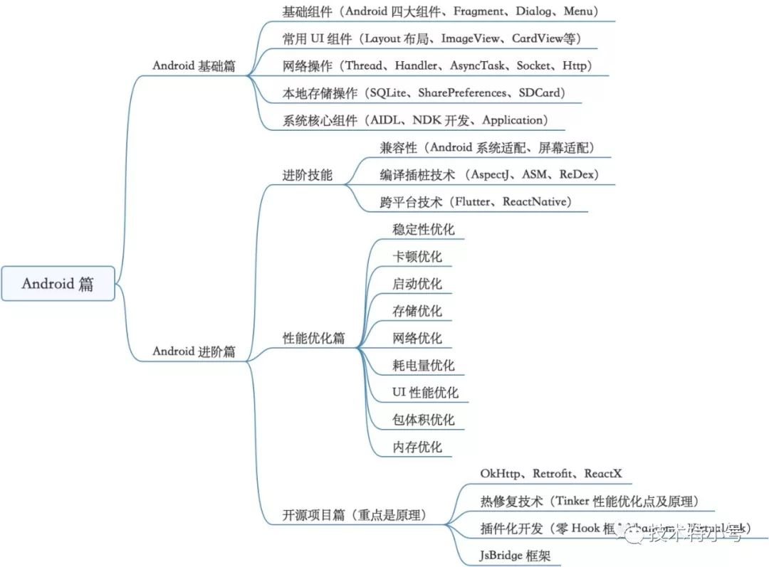 我梳理了一份 Android 面试技术复习路线图。面试复习、查漏补缺提升技能都能用到。包含以下几个板块,内容可能有遗漏欢迎同学补充。