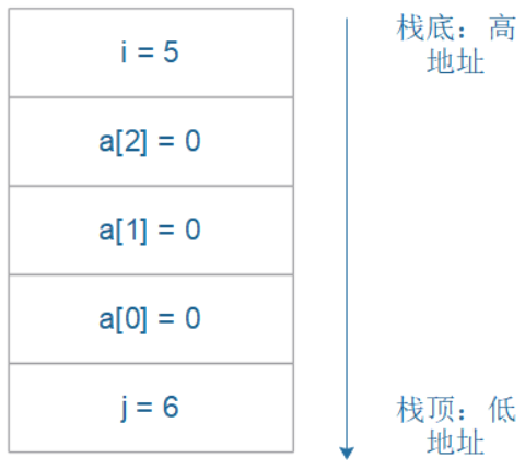 因为上述程序在执行 (1)之前,由于(1)之前的变量都是局部变量,所以存储在栈中。而上文说过了,栈的生长方向是向下的,且数组的元素地址是递增的,所以(1)之前的内存(栈)布局为: