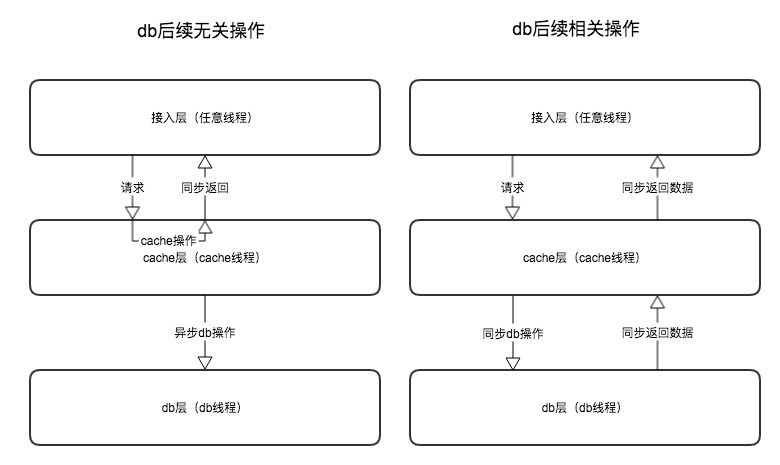 db后续无关的操作是从接入层不同的线程进入到cache层的队列,所有操作在这个队列里先同步完成内存操作,然后即可马上返回接入层,异步再到db操作层进行db操作。db后续无关的操作包括 save、update、delete。