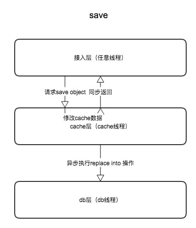 - save操作,同步修改内存cache,然后马上返回接入层,再异步进行db replace into 的操作