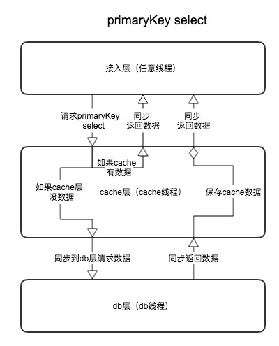 - select PrimaryKey,就是选一定PrimaryKey值的orm对象,这个操作首先看cache里面是否有primarykey 值的orm对,如果有,直接返回,如果没有,先同步到db线程获取查询结果,再同步修改内存里面的cache值,再返回给接入层
