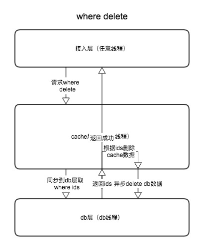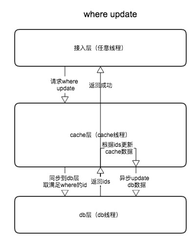 - update where,先同步到db线程通过where 条件select出需要update的主键值,根据主键值和需要update的内容,同步更新内存cache,然后异步进行db的update操作