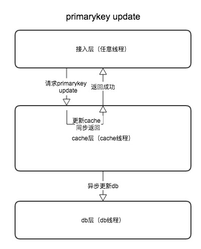 - update PrimaryKey,根据PrimaryKey进行update操作,先同步更新内存cache,然后异步进行db的update操作