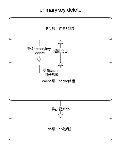 - delete PrimaryKey,根据PrimaryKey进行delete操作,先同步删除内存cache,然后异步进行db的delete操作