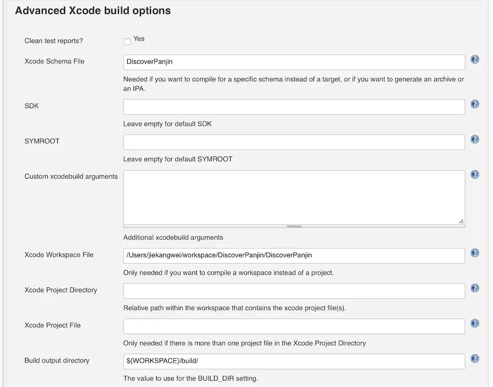 因为项目含有Workspace,所以填写Xcode Workspace File,填写该项目xcworkspace文件的绝对路径