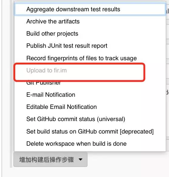 进入项目的配置页面,在构建后操作里选择Upload to fir.im,填写fir.im token
