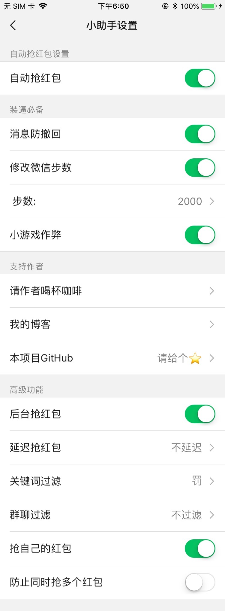 不止于抢红包,功能丰富的微信插件。本软件已成功运行在(iphone7-iphoneX) 微信7.0.0-7.0.2
