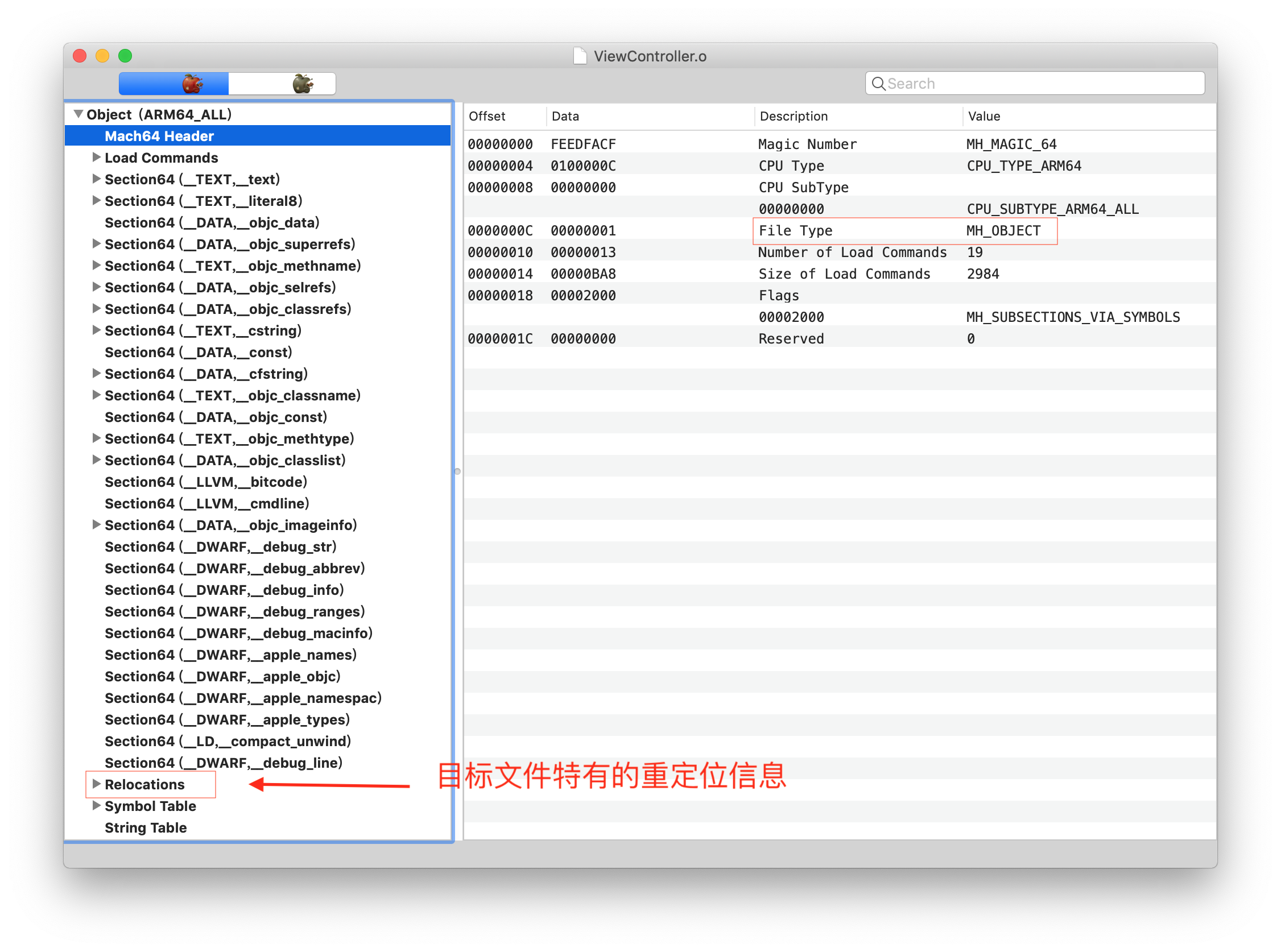 目标文件是一个mach-o格式的文件,在上面关于目标文件的介绍中有大体介绍目标文件的格式,要想了解更多关于目标文件的格式信息请参考一些相关的mach-o格式介绍的文档,以及后续我也会在相关的文章中进行详细介绍。