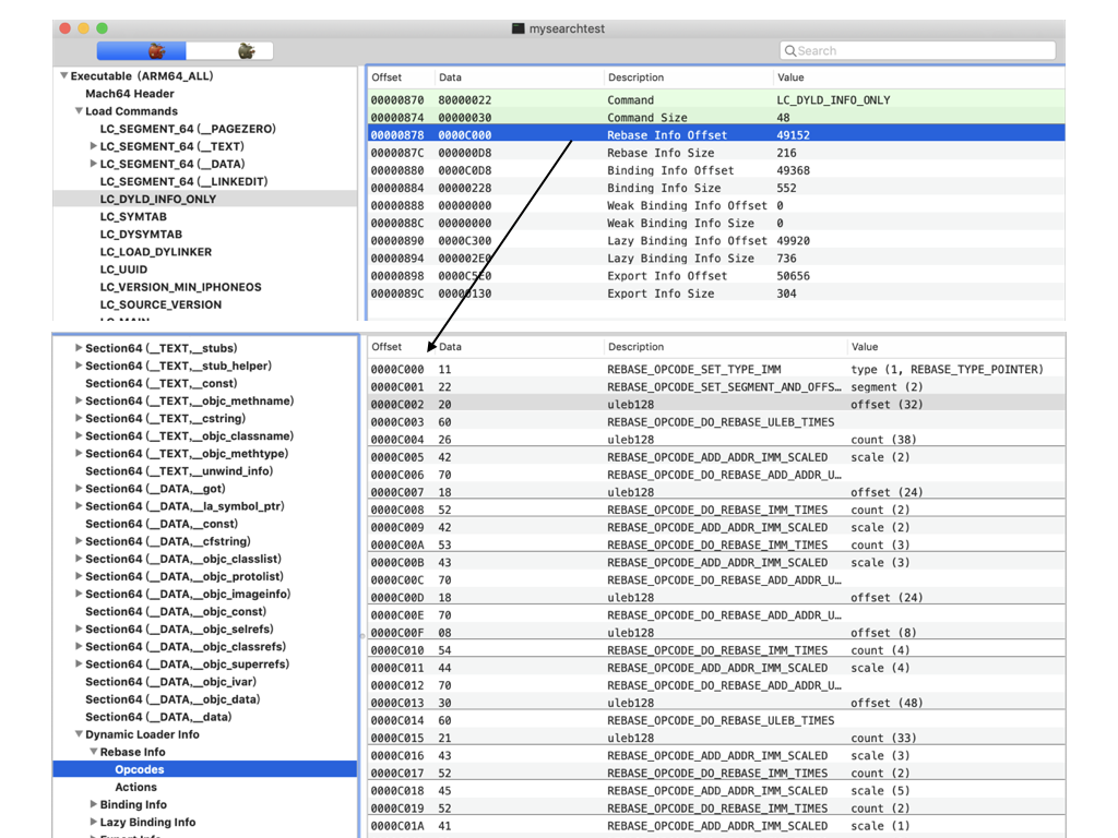 而刚才说了虽然程序生成时的基地址是固定的,但是的每次程序加载到内存的基地址是不一样的,而是一个随机值。因此程序加载的真实基地址和程序生成时的基地址值之间就有一个slide值,也就是地址差值。但是因为程序中很多地方的地址值都是以生成的虚拟基地址为基础的,所以在程序运行加载时需要对这部分函数地址进行基地址重定向(rebase)处理。为了实现rebase的能力,可执行文件的mach-o文件中会构造出一个LC_DYLD_INFO或者LC_DYLD_INFO_ONLY的load command,这个load command的结构描述是一个struct dyld_info_command,详细描述可以在<mach-o/loader.h>中看到。这个结构体中的rebase_off和rebase_size两个字段分别用来描述需要进行rebase的表的偏移以及需要进行rebase的数量。rebase表中记录着所有需要进行rebase的信息,这样当进程在加载时就会根据默认基地址的值和真实加载的基地址值之间的slide值来调整这部分内容的值。下面就是rebase段的内容: